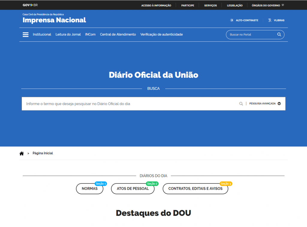 O portal da Imprensa Nacional, onde é publicado o Diário Oficial da União, irá passar por mudanças. O layout terá alteração significativa, se comparado ao utilizado atualmente. Além disso, o portal irá alinhar a sua interface às normas e diretrizes do padrão de Identidade Digital de Governo.